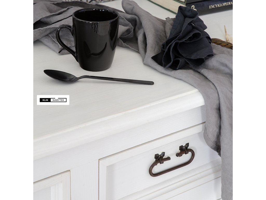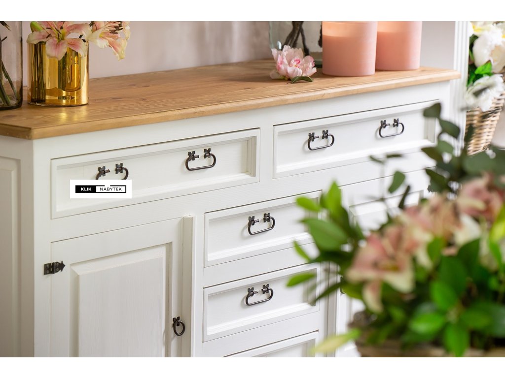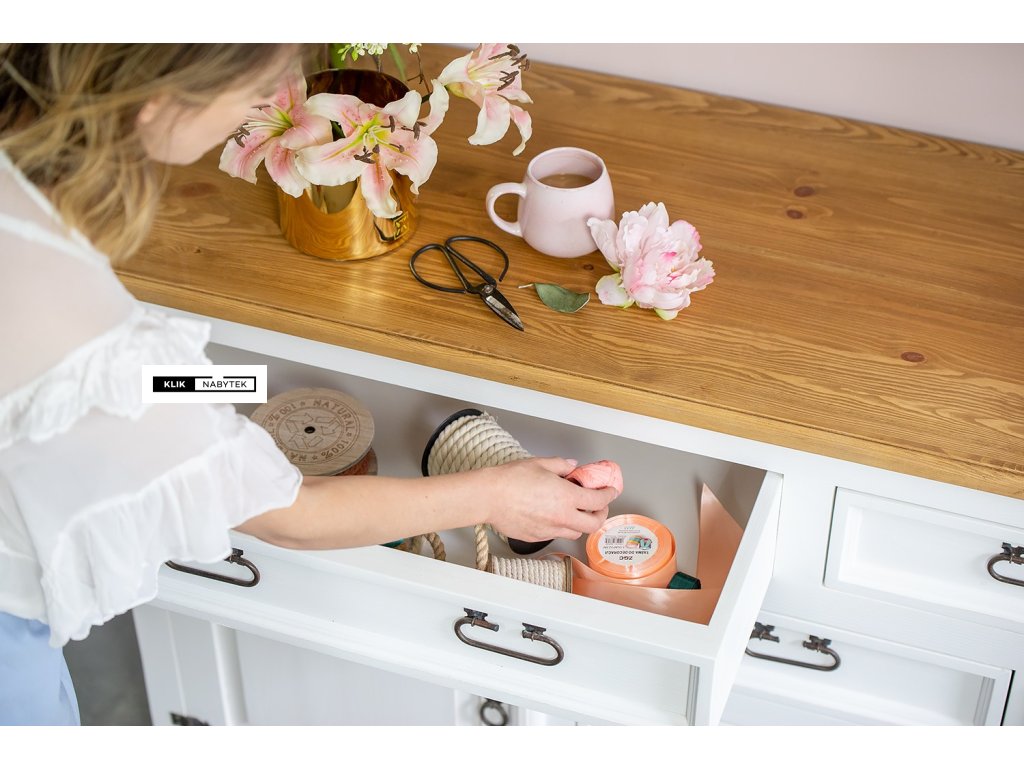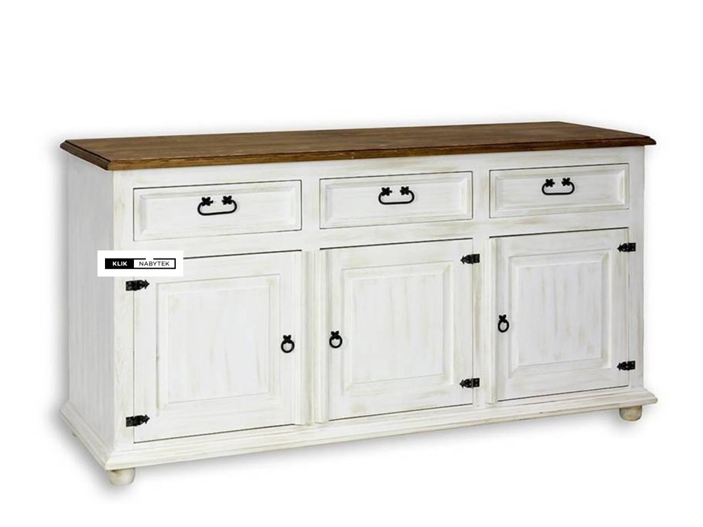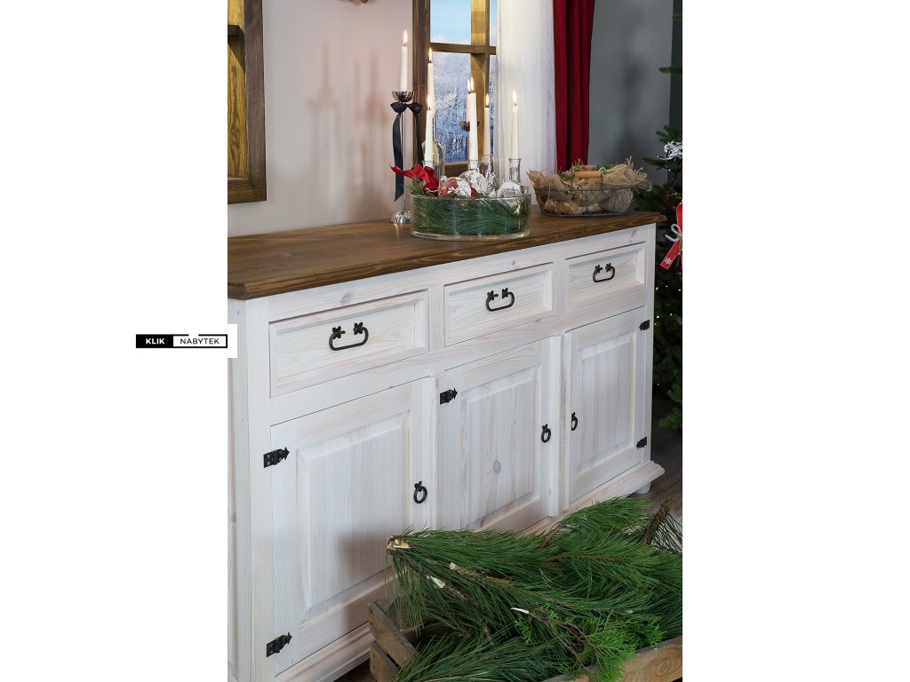 Rustikální masivní komoda POPRAD COM101 - borovice (bílý vosk) (z kolekce Poprad) patří mezi rozměrově širší a také hlubší typ borovicové komody se 3mi menšími zásuvkami a spodní částí s dvířky a policemi. Zásuvky a dvířka komody se dají velmi pohodlně otevřít pomocí černých kovových úchytek. Komoda je nabízena v atraktivních odstínech bílých vosků (bílý vosk, bílá patina, antická bílá nebo jejich kombinaci se světlým a tmavým voskem), díky kterým získává nábytek neopakovatelný vzhled. Na komodě jistě oceníme její precizní zpracování a jednotlivé tvarové detaily. Komoda se díky její velikosti a vnitřnímu uspořádání hodí nejen do domácího prostředí obývacích pokojů, jídelen nebo kuchyňských koutů, dětských pokojů, hostinských pokojů, ale také do předsíní nebo na chaty a chalupy. Díky široké škále výrobků z kolekce Poprad si jím můžeme zařídit i apartmány, kanceláře, aj. komerční nebo ubytovací prostory. Nespornou výhodou borovicového nábytku je kromě přirozeného vzhledu a vůně přírodního dřeva také jeho příznivá cena a nesporná velká odolnost v prostředích s většími teplotními výkyvy, kde ostatní typy lepených dřev (buková nebo dubová spárovka) trpí.