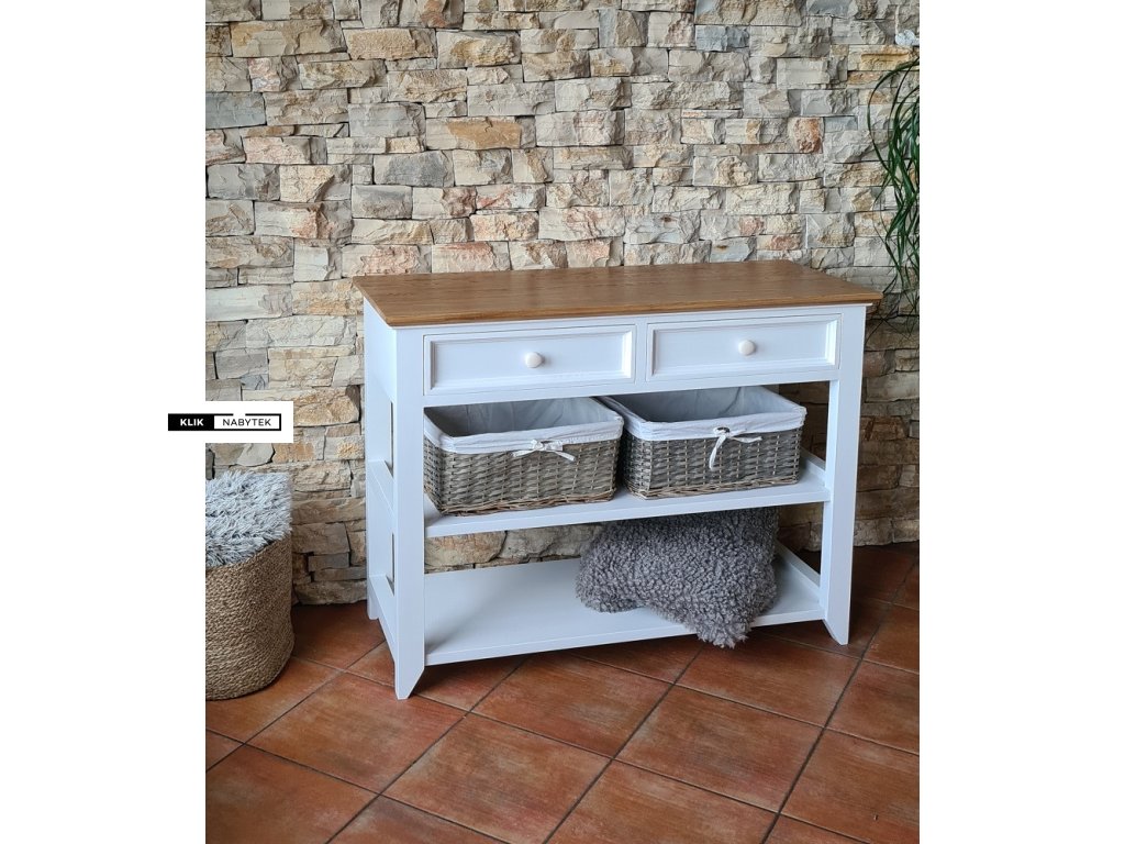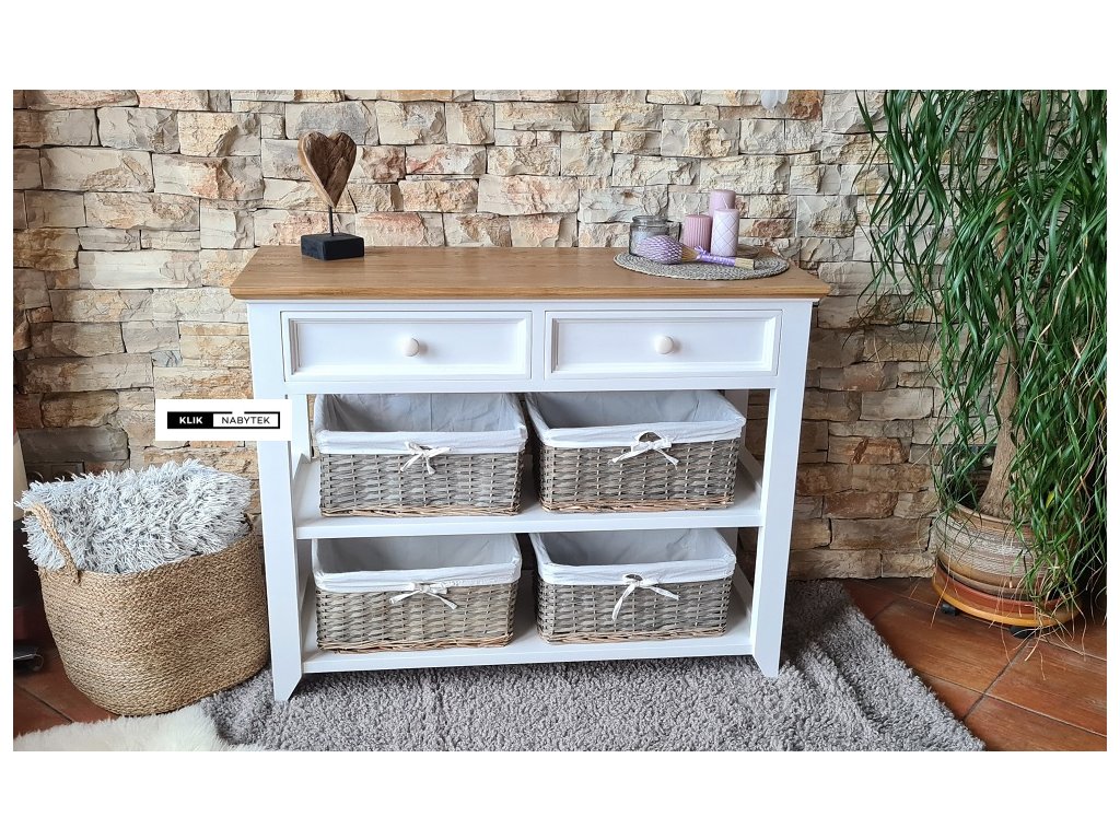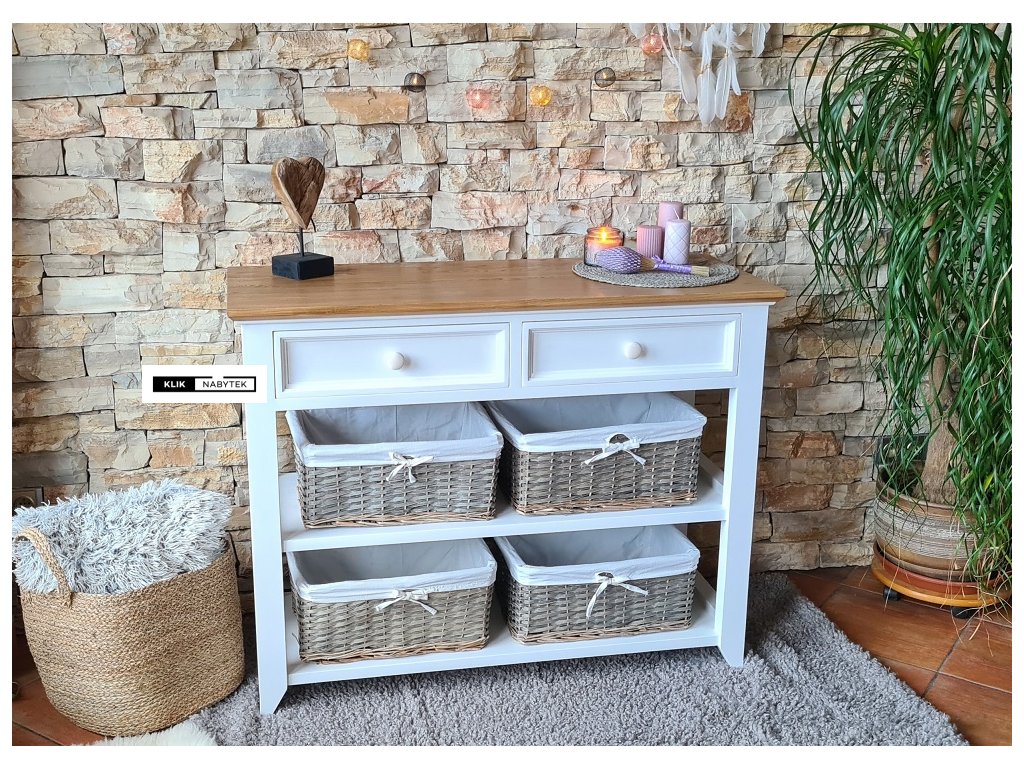 Komoda FLEUR-K14P (Bílá) řadíme do široké škály kolekce FLEUR, kde nalezneme nejrůznější komody všech typů a rozměrů. Produkty se vyznačují nadčasovým francouzským stylem. Tento elegantní design je nadčasový. Komoda je vybavena dvěma zásuvkami a dvěmi otevřenými policemi, které spolu s horní deskou umožňují dostatečné množství úložného prostoru. Celá kolekce vyniká pečlivým výběrem materiálů – základní konstrukce nábytku je vyrobena z masivního buku, zatímco horní deska je ze dřeva dubového. Specifická barevnost je dosažena kombinací akrylové barvy na bukových částech a olejové úpravy dubových desek, což umožňuje vyniknout přirozenosti dřeva. Díky své univerzálnosti se komoda hodí nejen do moderních, ale i klasicky vybavených interiérů. Najde si své místo téměř ve všech místnostech - obývacích pokojích, pracovnách, kancelářích, ložnicích. S nábytkem z kolekce FLEUR si můžete zařídit celý pokoj, byt nebo rodinný dům – ideální volba pro milovníky přírodních materiálů a elegantního stylu.