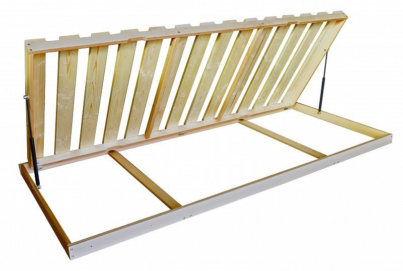Lamelové rošty do postele výklopné – výklopný rošt do postele volíme v případě, že se v naší posteli nachází pevný úložný prostor. Výklop může být buď z boční strany nebo od nožní části. Výklopné rošty na postel usnadňují přístup do úložného prostoru i v menších místnostech, kde si nemůžeme dovolit úložný prostor ve formě vysouvací zásuvky.