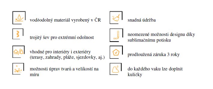 Velký hranatý sedací taburet s předpěněnými polystyr. kuličkami EPS. Tkanina s protihořlav. složkou. Rozměry (v x š): 60 x 40 cm. I pro exteriér. Váha: 1,6 kg. Nosnost: 150 kg. Český výrobce.